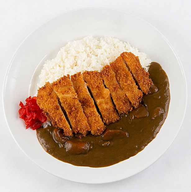 Cubierto con arroz al curry casero y chuleta de cerdo frita crujiente.